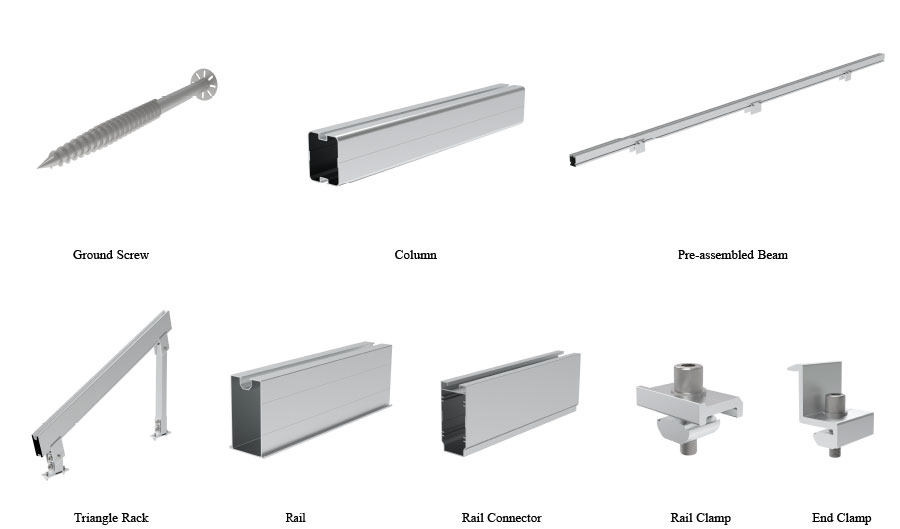 Agriculture mounting system is designed as plant planting shed or livestock breeding shed. The shading rate is always considered during the design to ensure the sunlight required. This kind of mounting system can maximum the use efficient of the land space. The main parts are Ground Screw, Column, Pre-assembled Beam, Triangle Rack, Rail, Rail Connector, Rail Clamp, End Clamp.