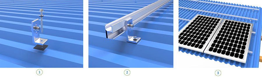L Feet mounting system is a common solution for trapezoid metal rooftop, the main parts are L Feet, Rail, Rail Connector, Mid Clamp and End Clamp.
