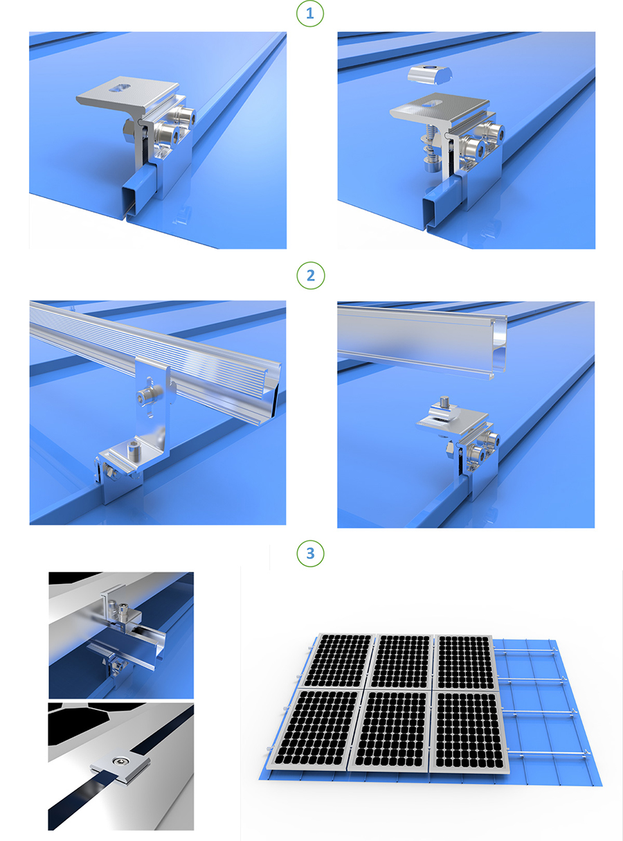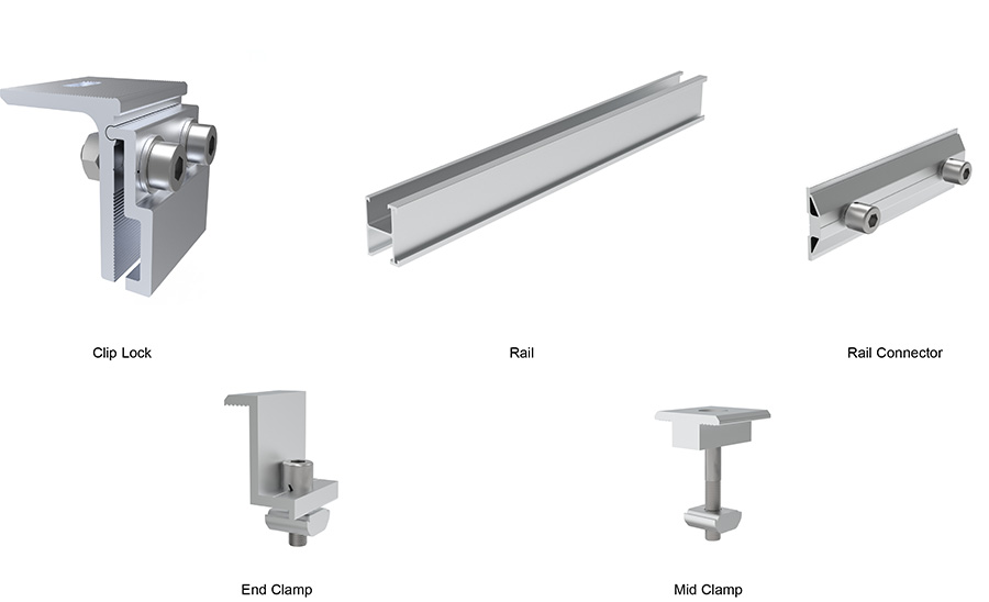 Clip Lock mounting system is a specific solution for non trapezoidal metal rooftop, the principle of this solution is to use Clip Lock to grab the roof. The main parts are Clip Lock, (L Feet), Rail, Rail Connector, Mid Clamp and End Clamp.