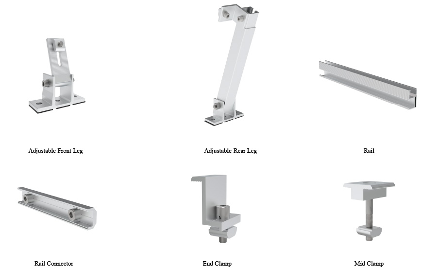 Adjustable Leg mounting system is designed to meet the requirement of adjustable tilt angle of the bracket, so the adjustable components are used. This mounting system can be installed on both metal roof and flat concrete rooftop. The main parts are Adjustable Front Leg, Adjustable Rear Leg, Rail, Rail Connector, Mid Clamp and End Clamp.