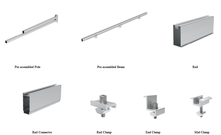 Aluminum Carport mounting system is not only a solar plant but it also offer a shelter for the cars to avoid the raining and the heat of the sun, therefore, this kind of mounting system can maximum the use efficient of the land space. The main parts are Pre-assembled Pole, Pre-assembled Beam, Rail, Rail Connector, Rail Clamp, End Clamp and Mid Clamp.