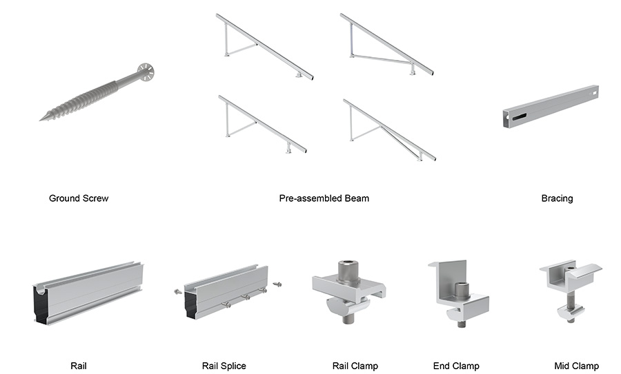 Ground Screw Foundation mounting system can be applied to medium and large scale solar PV projects. It is designed strictly according to clients’ requirements and the necessary conditions such as the optimal angle, minimum ground clearance, max wind speed, snow load and so on. The installation is easy and can save much time and labor cost. The main parts are Ground Screw, Pre-assembled Beam, Back Bracing, Rail, Rail Clamp, Rail Connector, Mid Clamp and End Clamp. According to the different shapes of Pre-assembled Beam, this kind of mounting system can be divided into A type, N type, VI type and W type.
