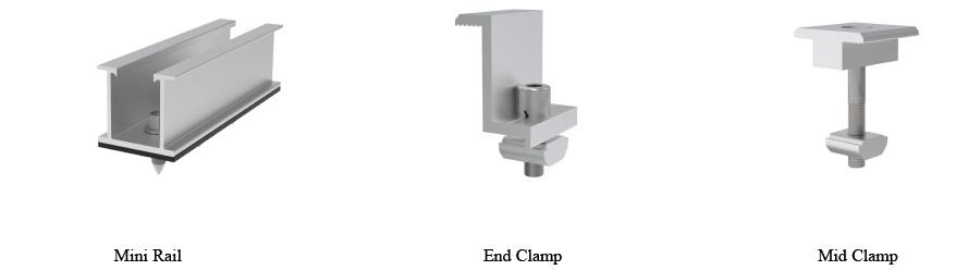 Mini Rail mounting system is a simple and cost-effective solution for trapezoid metal rooftop, the main parts are Mini Rail, Mid Clamp and End Clamp.